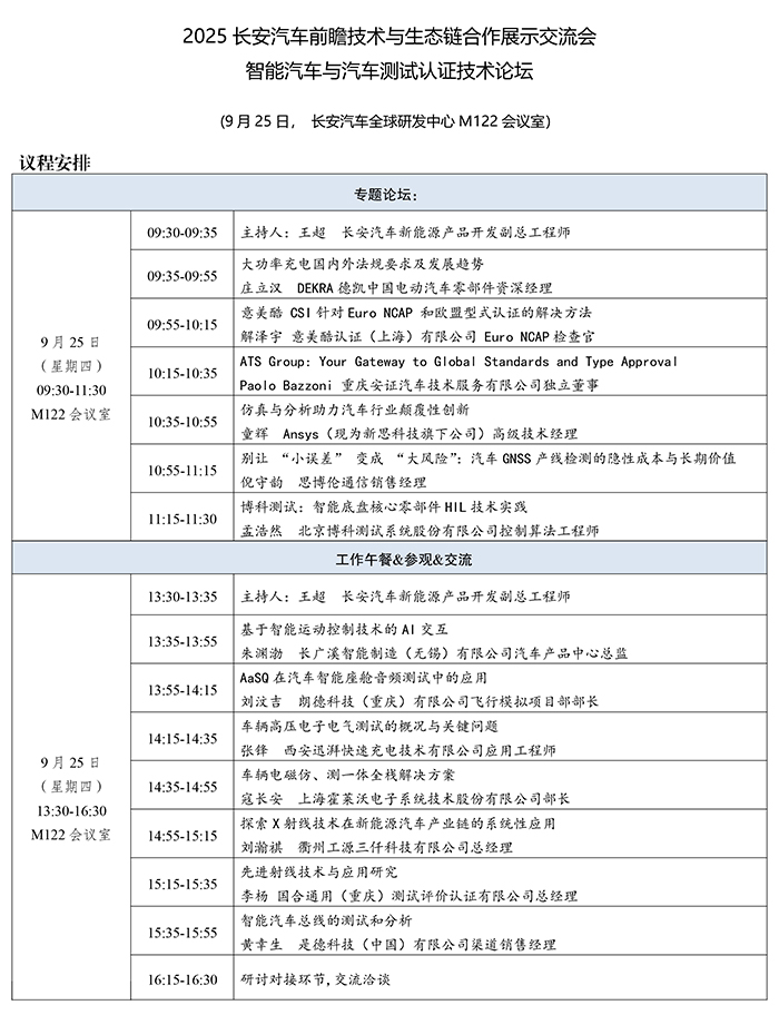 本次同期还举办了“2025 智能汽车与汽车测试测量与质量认证论坛”的百人论坛,参会人员定向邀请长安的主管工程师参加;围绕汽车测试、开发和验证技术设计议题,这些议题包括:出海法律法规测试、ADAS和自动驾驶汽车测试、电动和混合动力系统测试、电池和续航里程测试、以及所有其他测试和验证技术。